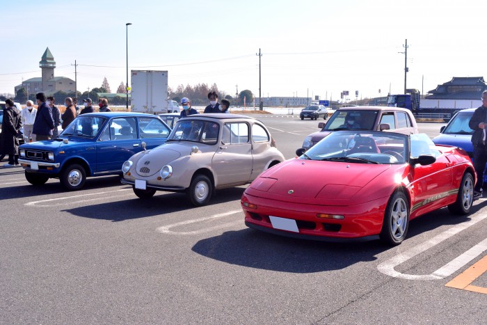 ▲こちらのキュートなクルマたちは手前から、ロータス エラン(M100)、スバル 360、三菱 ミニカ