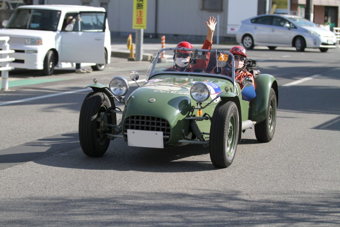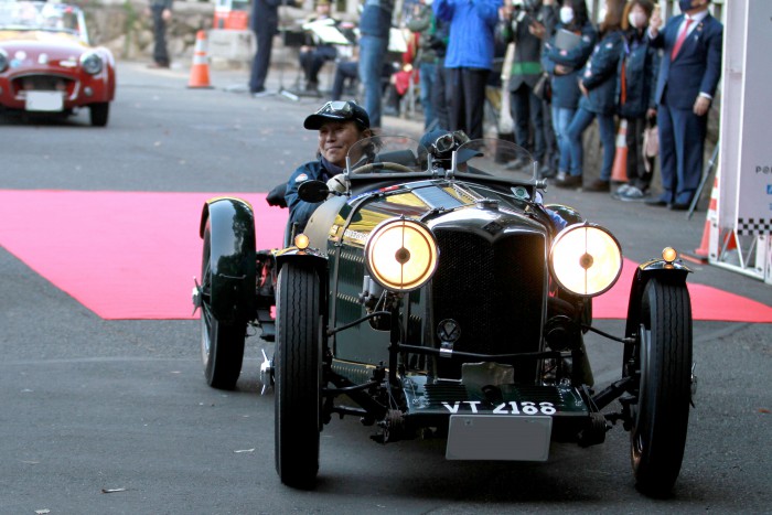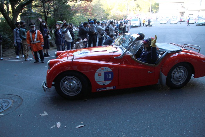 ▲8時半をまわり、いよいよスタート。ギャラリーからは次々に「いってらっしゃい!」「楽しんでね!」と声援が。スタートするトライアンフ TR3(1961)