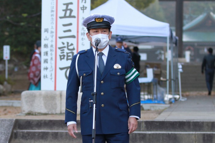 ▲岡山中央署による交通講話も。「子どもたちに憧れられるドライバーに」と呼びかけ