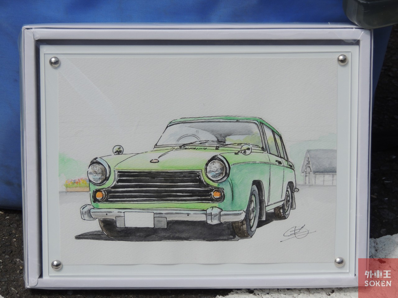 いつものように額に入れて会場本部へオーナーの方にお知らせしてくださいと持っていくと「えーと、これボクのクルマです」と主催者の有山氏。図らずも渡したご本人の車両という偶然。これは絵描きも驚きました。