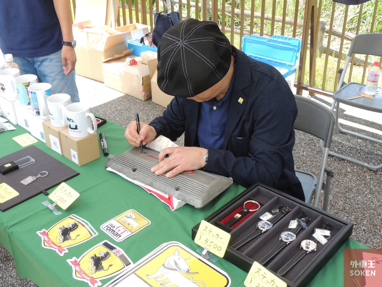 実は登壇した方々のほかにも物販ブースのテント内にはマンガ「GTロマン」の作者である西風氏が待機、訪れたファンに対してサインを行っていました。画像ではメモ帳や色紙ではなく、なんとアルファのV6エンジンのヘッドカバーに描いている姿が。あまりの予想外な依頼にも笑顔で応じていました。