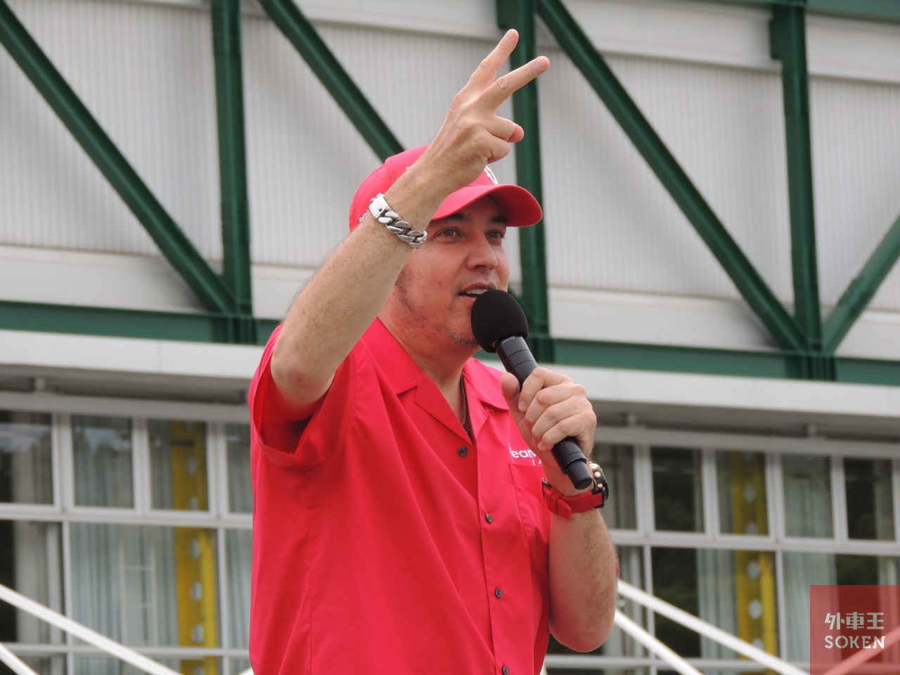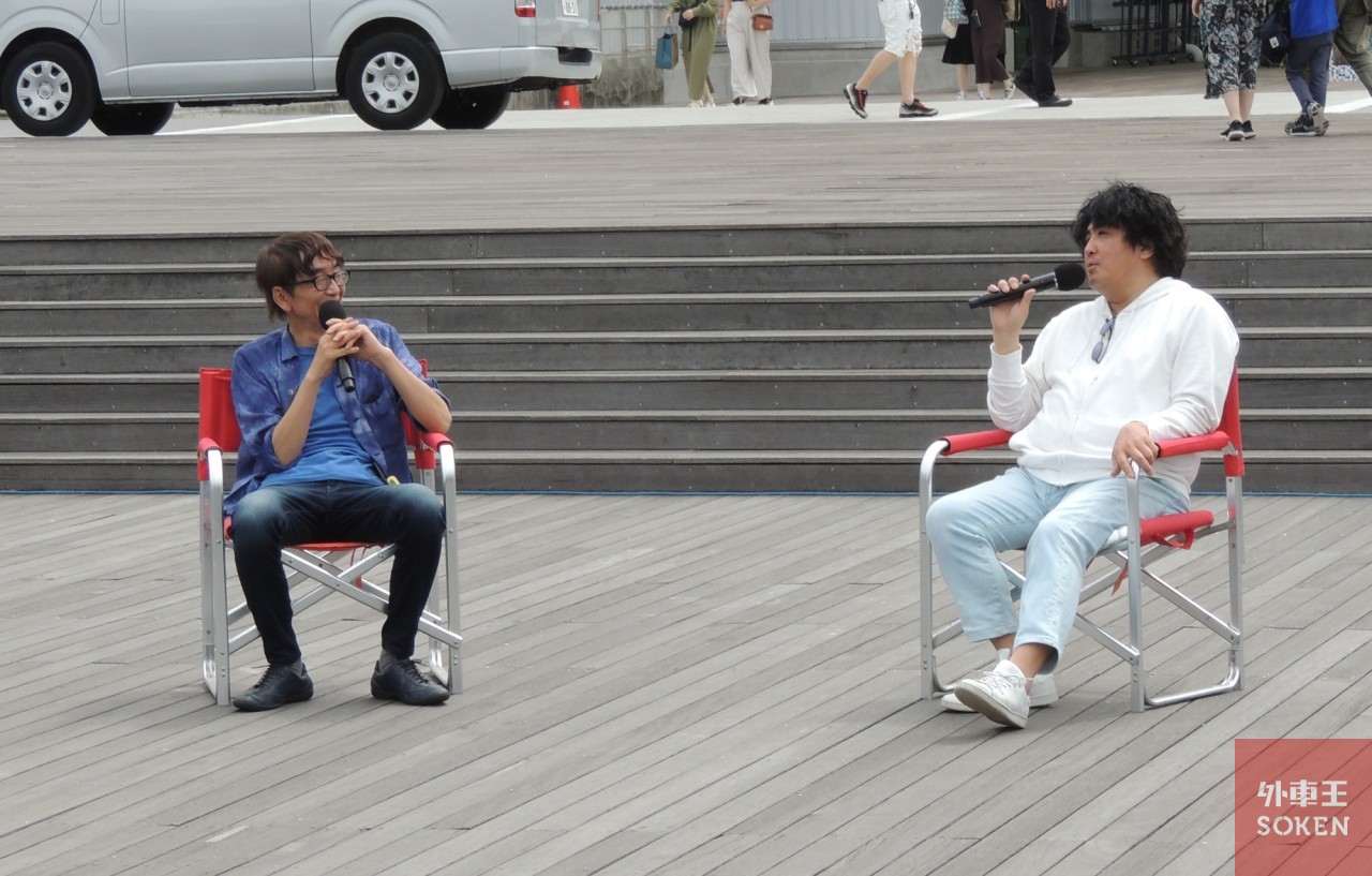 自身のラジオのボールペンをアプリ登録者にプレゼント。恒例のチンクチェント博物館の深津館長と自動車ライター嶋田智之氏によるトークショーでは1台ずつじっくりと解説、またジャンケン大会ではジェームズ・ヘイブンス氏が参戦!ヘイブンス氏は挨拶でも暴走気味のトークにて会場を多いに盛り上げてくれました。