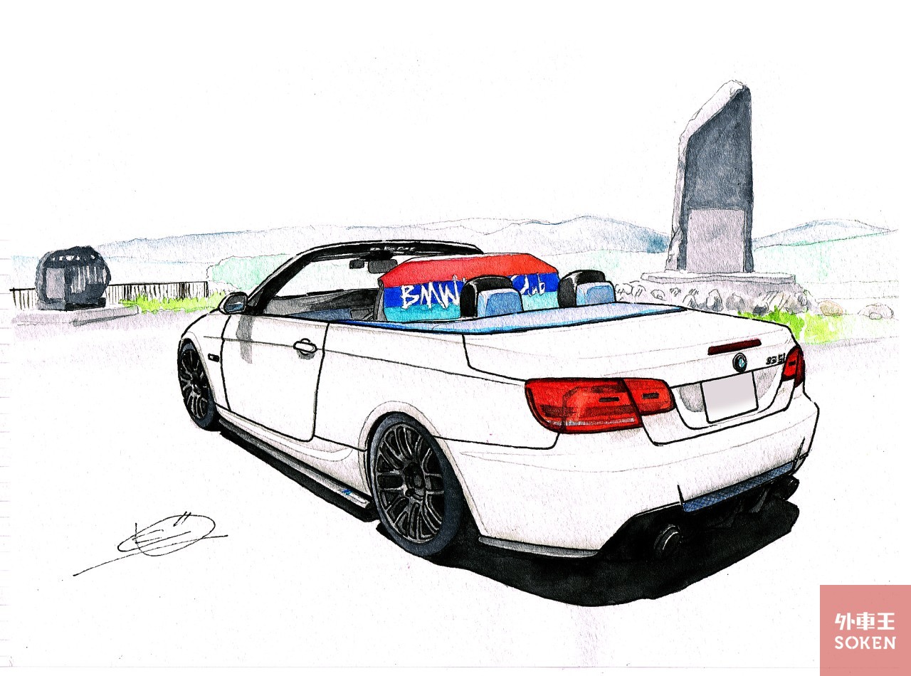 毎回イベント会場で私が独断でこの日一番に目に留まった車両を描く今日の1枚。陽気なラテン車ではなく、どこか実々剛健なイメージを持ちながらもアバンギャルドな雰囲気を併せ持つメーカーBMWから、E90系の335カブリオレです。