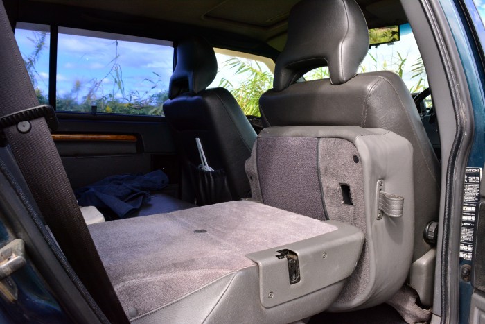 「あれはまだ親父が乗っていたころ、部品が緩くなりばーんと落下してしまったので、保存はしてありますが以後そのままです。犬用でもいいですし、荷物をヘッドレストより高く積んだとき、前になだれ込まないためにもあるんです」