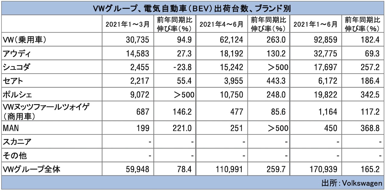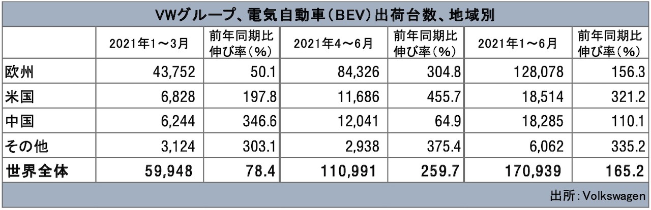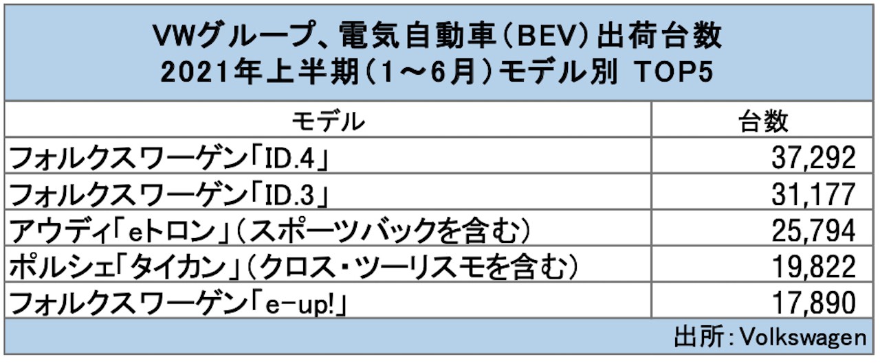 独自動車大手のフォルクスワーゲン(VW)は20日、VWグループ全体の2021年上半期(1~6月)の電気自動車(BEV)の出荷台数が17万939台となり、前年同期(6万4,462台)に比べ2.5倍以上(165.2%増)に拡大したと発表した。プラグインハイブリッド車(PHEV)の販売も好調で、今年上半期の出荷台数は17万1,300台と、前年同期の3倍以上(204.2%)に拡大した。