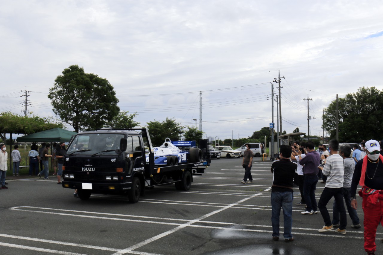 イベント参加車両(これは別記事でご紹介いたします!)とギャラリーがぞくぞくと集まってくるなか、ついに真打ち登場。キャリカカーに載せられたタイレルP34が姿を現すと、あっという間に人だかりが。男の子がスマホで撮影しているのを邪魔しないように、こちらも負けじと(?)撮影します。