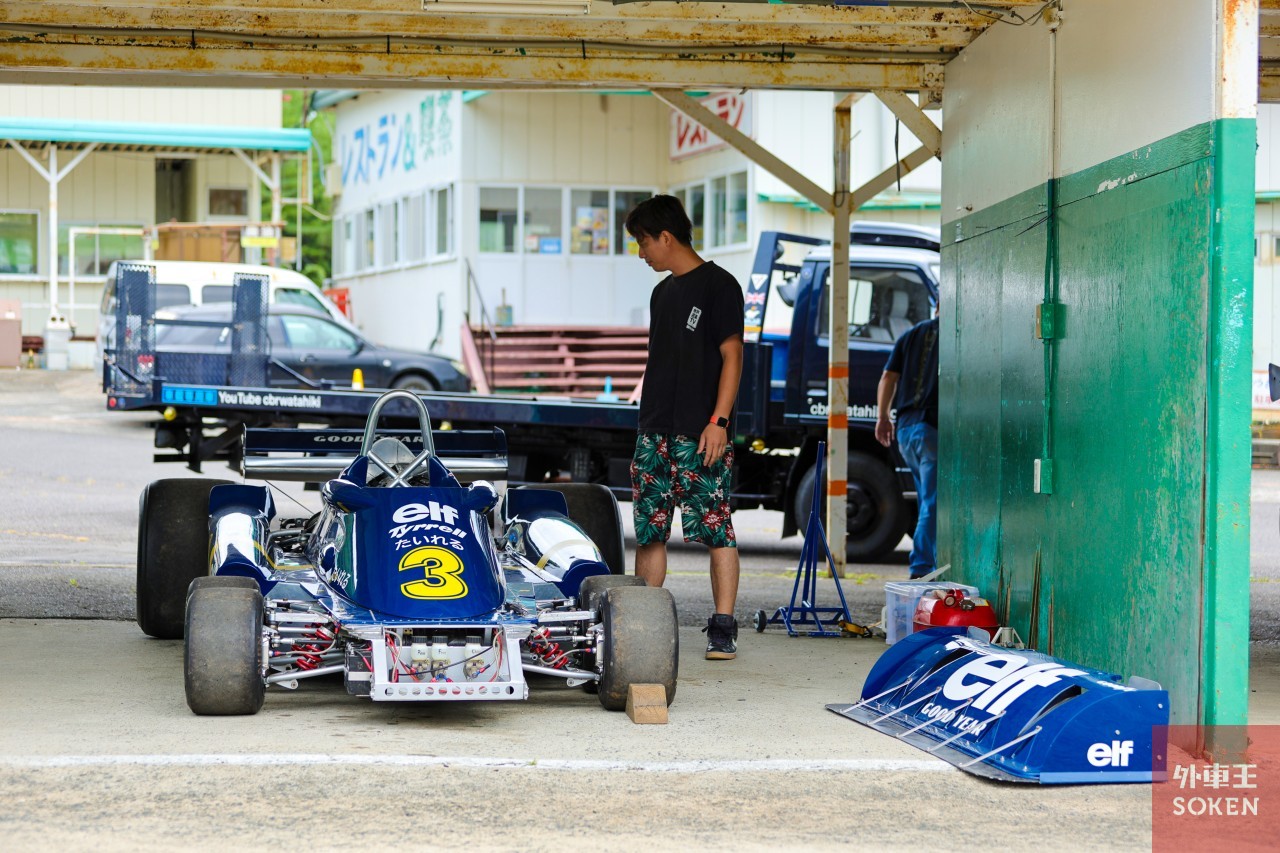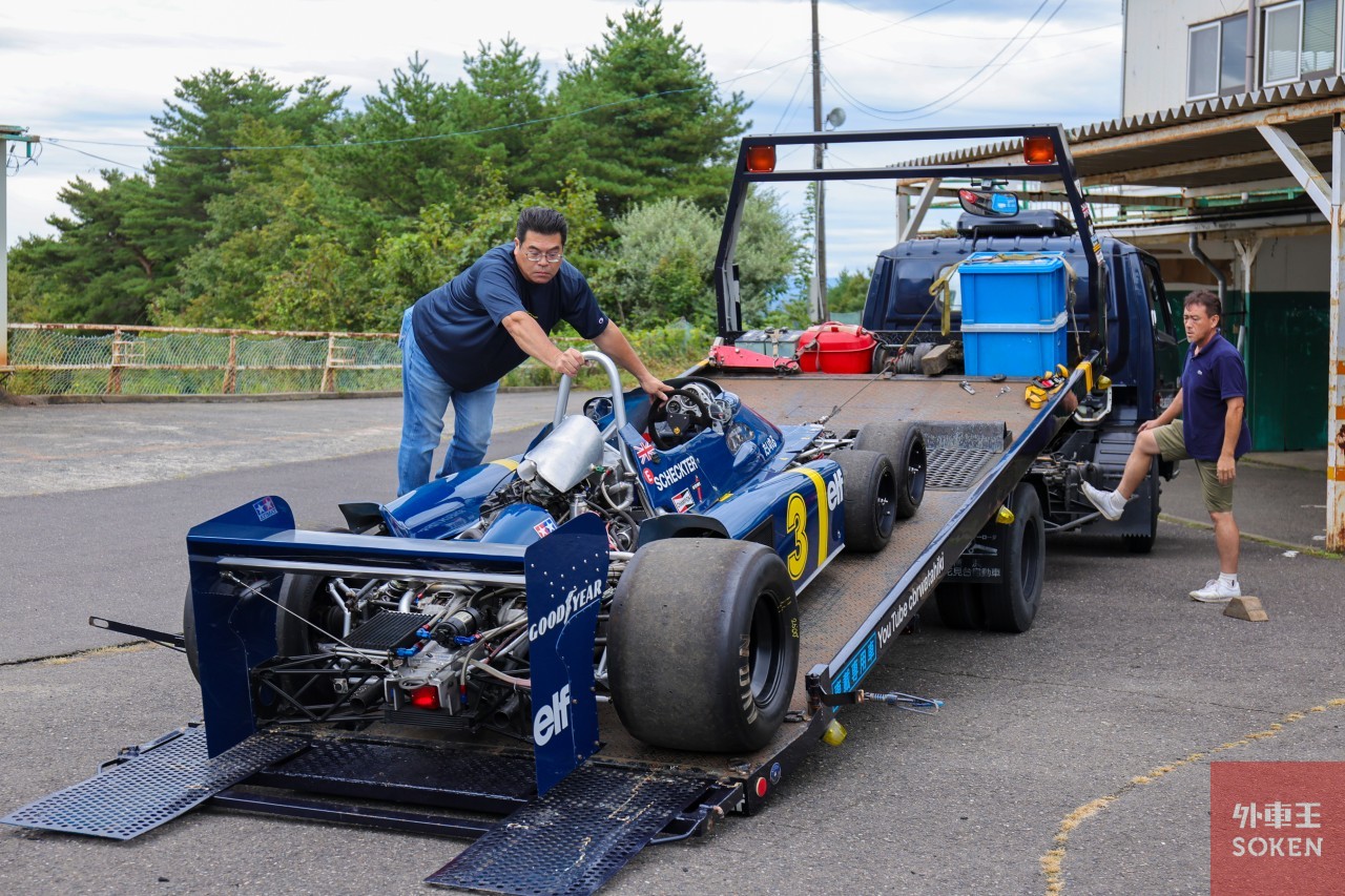 午前9時からミーティングがはじまり、9時10分から慣熟走行、そして9時30分から45分ほど参加者の方たちのフリー走行がスタート。タイレルの1回目の走行枠は10時15分から30分間。サポートメンバーの皆さんの手により、キャリアカーからタイレルを降ろしてピットへ移動。