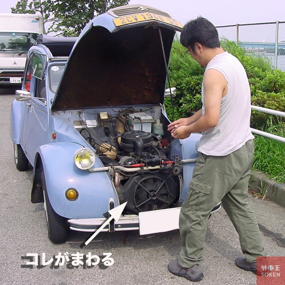 したがって強引に表面積増やして冷やすタイプですが、2CVのエンジンには「ヒレヒレ」がついてません。ヒレヒレはないけど、空冷なので、エンジンルームにラジエーターもございません。・・・ので、概ねご想像の通り「走って冷やす」タイプです。