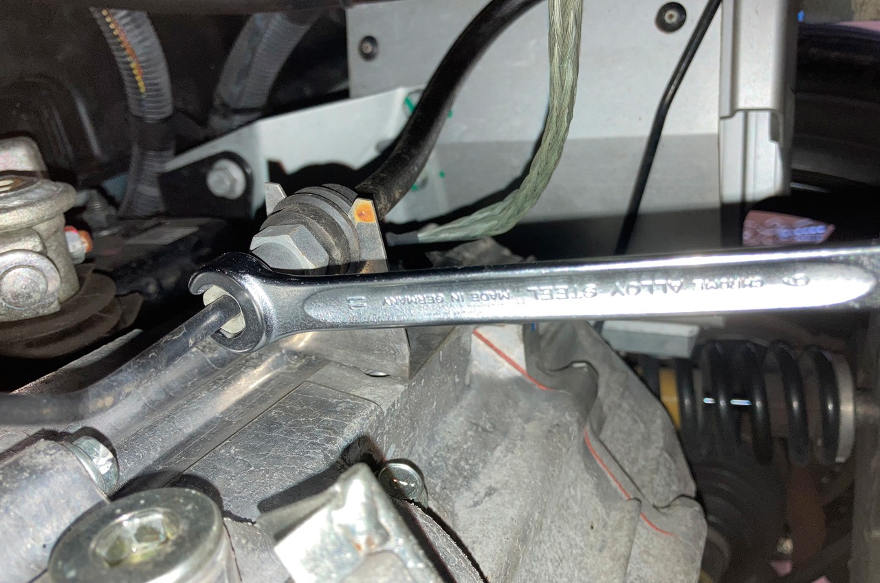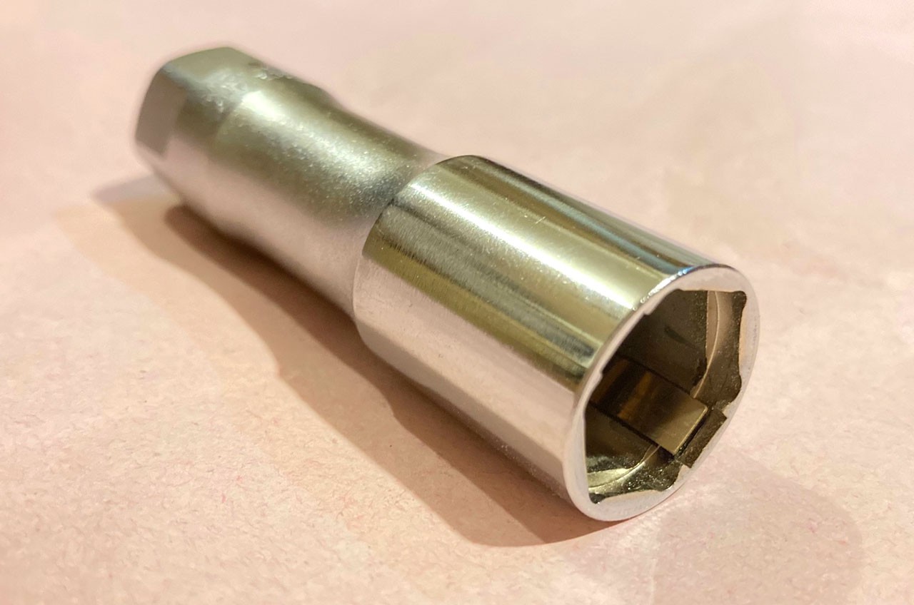 ▲ナットが貫通していてメガネがかけられないときはコレ!「普通のスパナでいいじゃん」と思われがちですが、こういうナットに限ってやわらかい金属が使われていたりします…。そんなとき、接触面が多いフレアナットレンチだと安心!ブレーキフルードのエア抜きで、メガネかける前にホースつけちゃった…なんてときもこれで解決(笑)