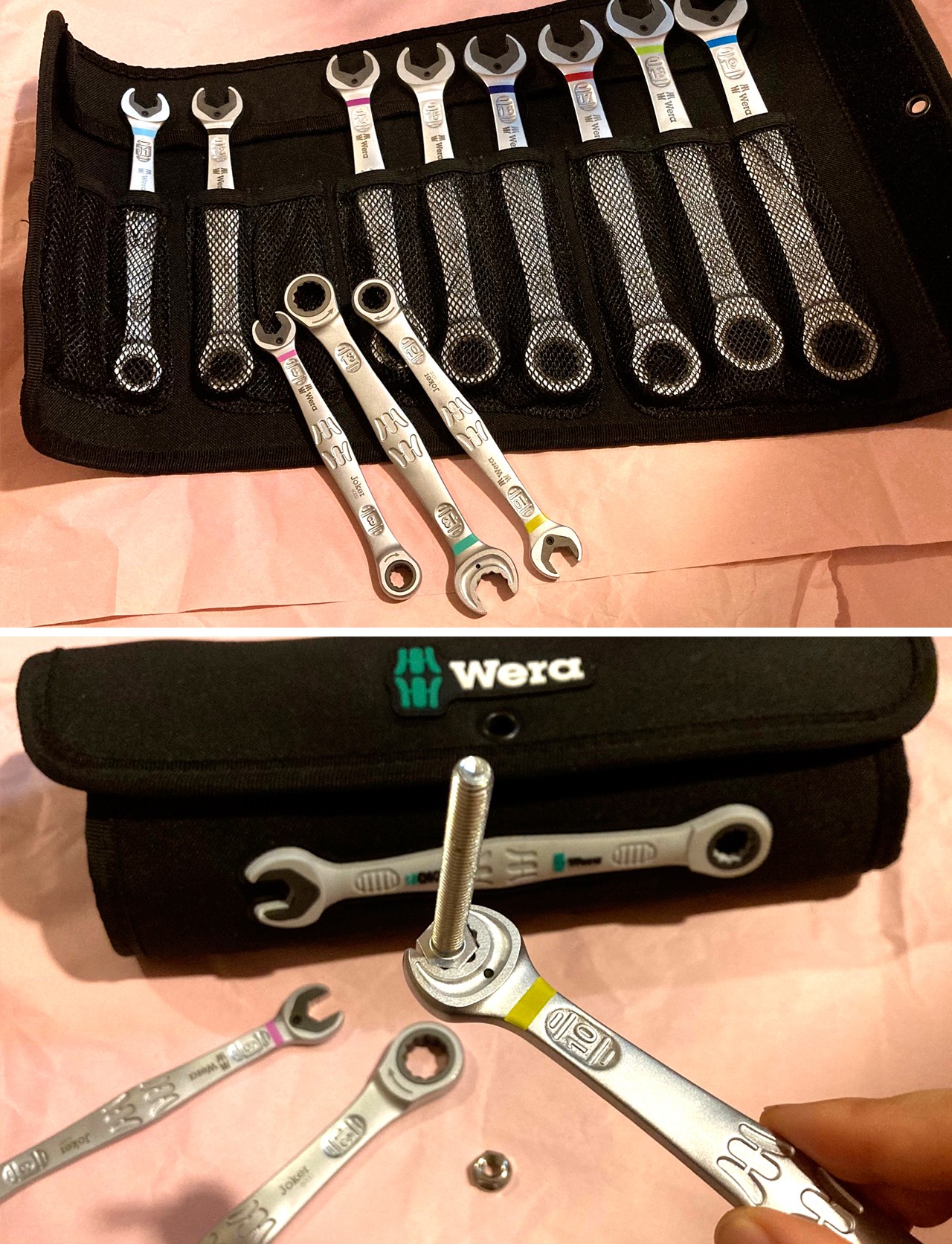 ▲Wera ジョーカーコンビネーションラチェットレンチ(ロールケース付き11本セットで約¥32,000)