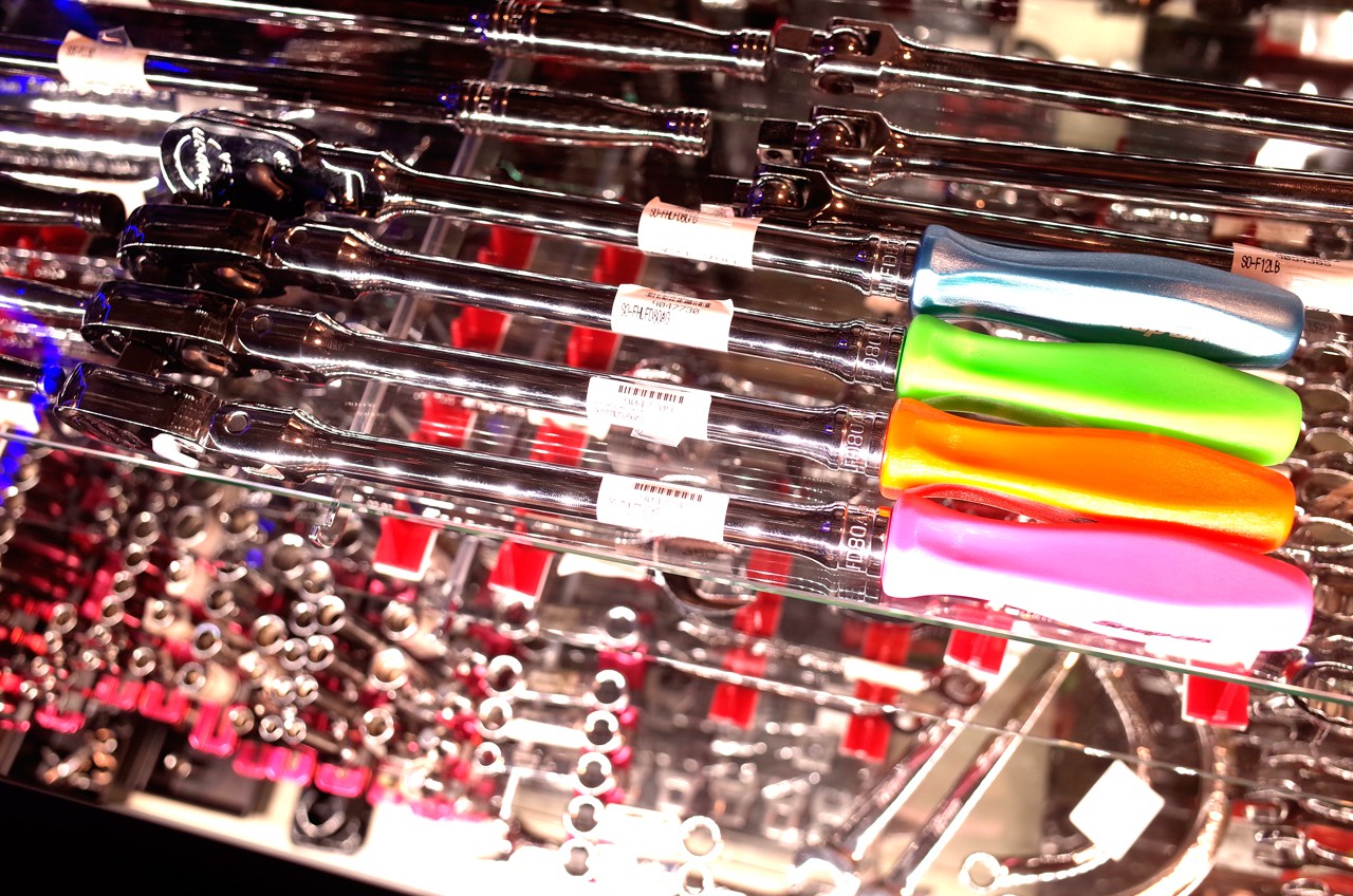 ▲筆者は基本梨地派ですが、SNAP-ONやNEPROSなどのピカピカメッキも美しいです!油が付着した際の握り心地は、素手派・グローブ派・拭きながら使う派etc...でそれぞれなので、梨地or光沢は実際に手に取ってみるのが一番。もちろん見た目で選ぶ人もたくさんいます(撮影協力:ワールドインポートツールズさん)