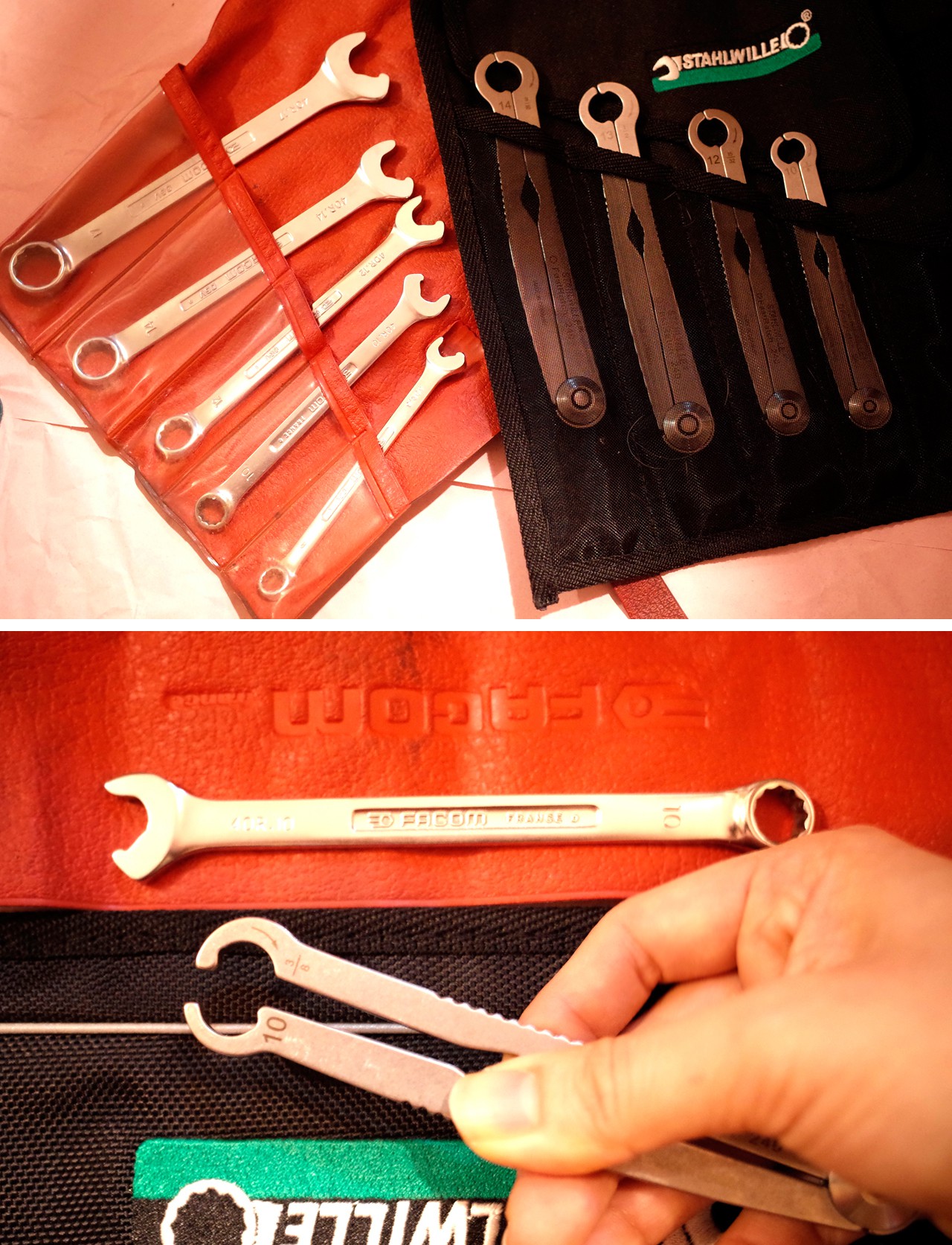 ▲FACOM ファーストアクションレンチ(5本セットで¥10,000くらいだったような??)、STAHLWILLE ファストラッチ(4本セットで約¥20,000)。ともにロールケース付き