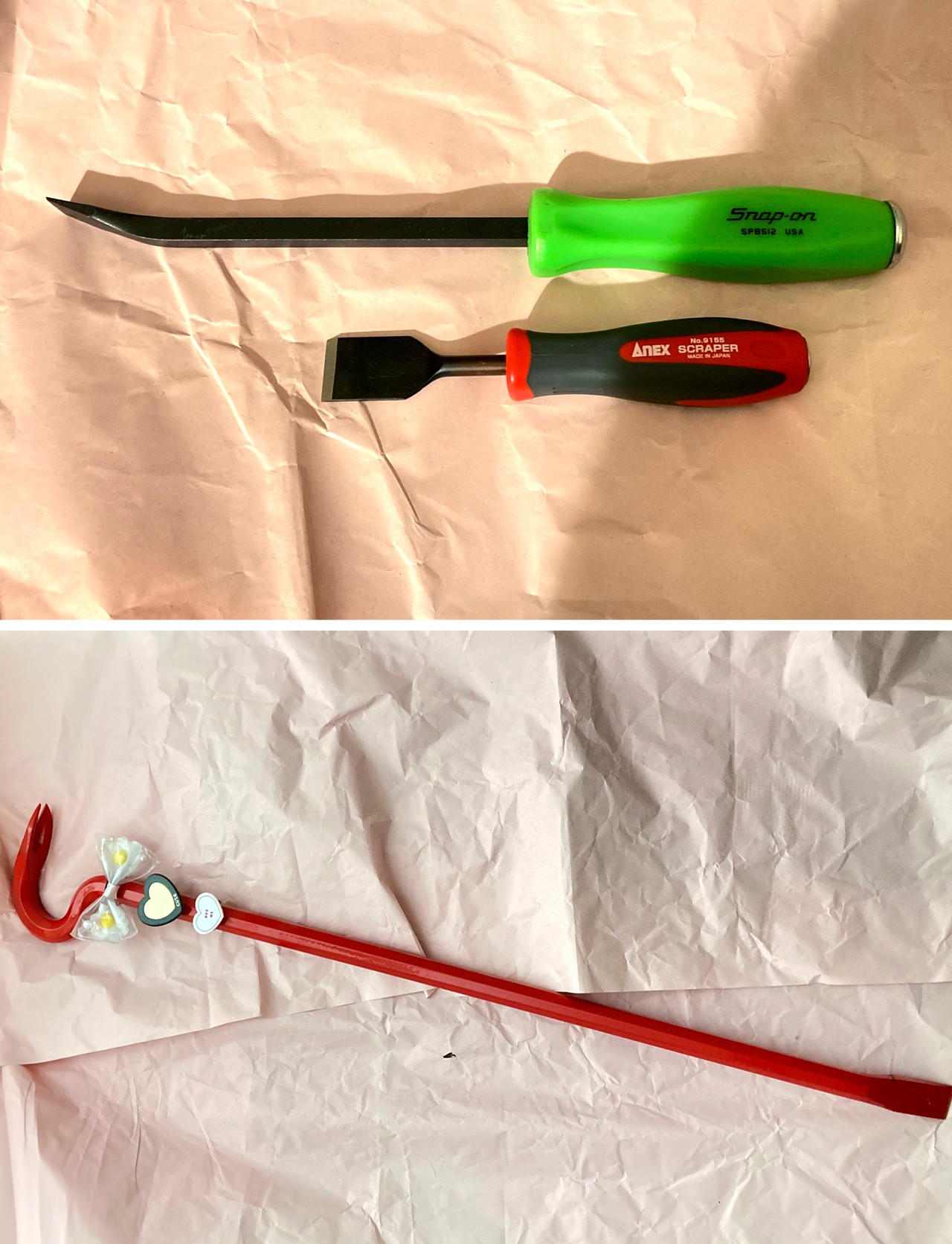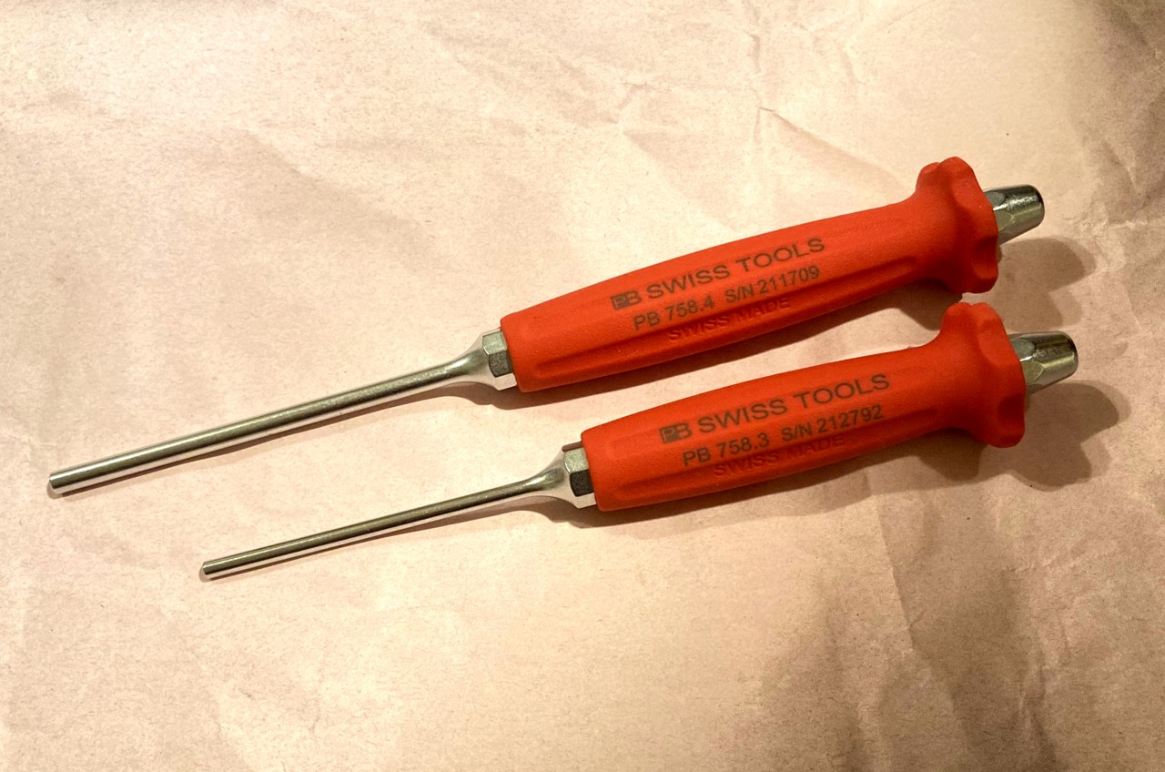 写真左側2本は、持ち手側の先端が金属になっている貫通ドライバー。硬くてなかなか回らないとき、金属部分をハンマーで叩いてネジに刺激を与えると、緩んでくれる(かもしれない)お助けアイテム。