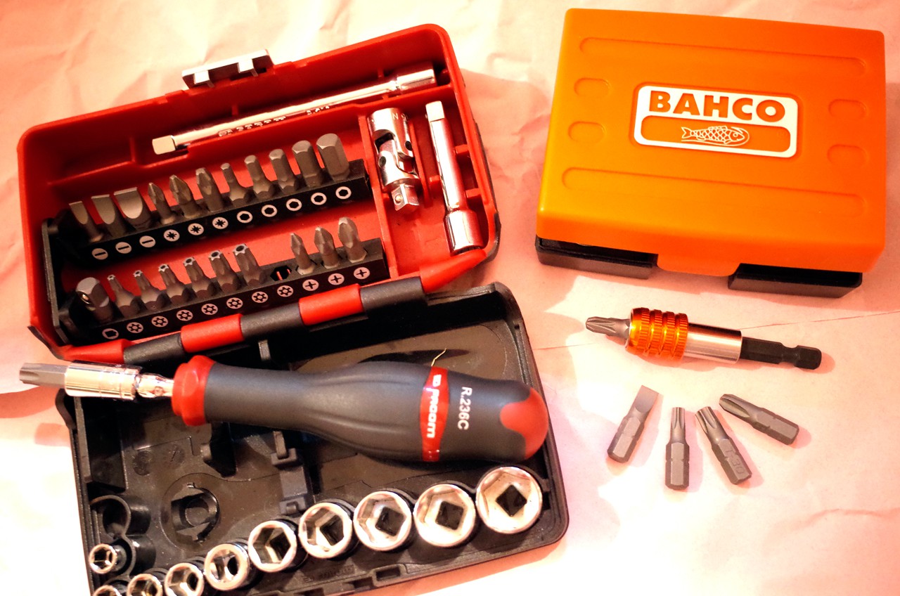 ▲専用の持ち柄に差し替えて使えるビットタイプ。セット工具では必要サイズがほぼ入っていることがほとんどなので、手持ちのノーマルドライバーにサイズがないとき重宝します。FACOM Rnano1/4(ラチェットセットで¥9,000くらい、たぶんセール品)、BAHCO ミニチュアラチェットセット1/4(約¥3,500)いずれも基本サイズのソケットやビット入り