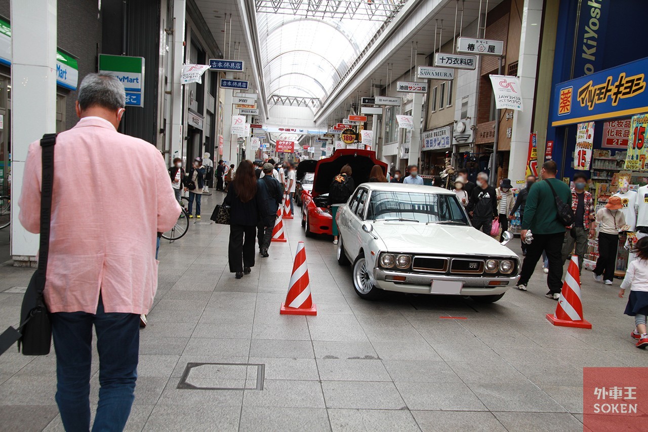 ▲公園周辺の商店街も車両の展示会場に。アーケードには二日間に渡って名車が並んだ