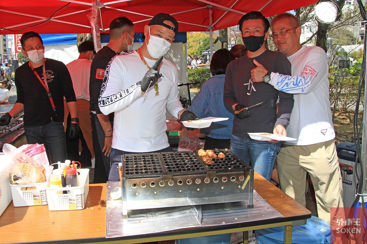 ▲仲間とともに笑顔でたこ焼きを販売!参加車両とグルメでイベントを盛り上げる