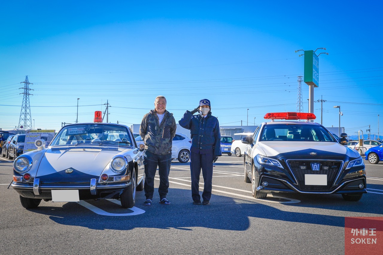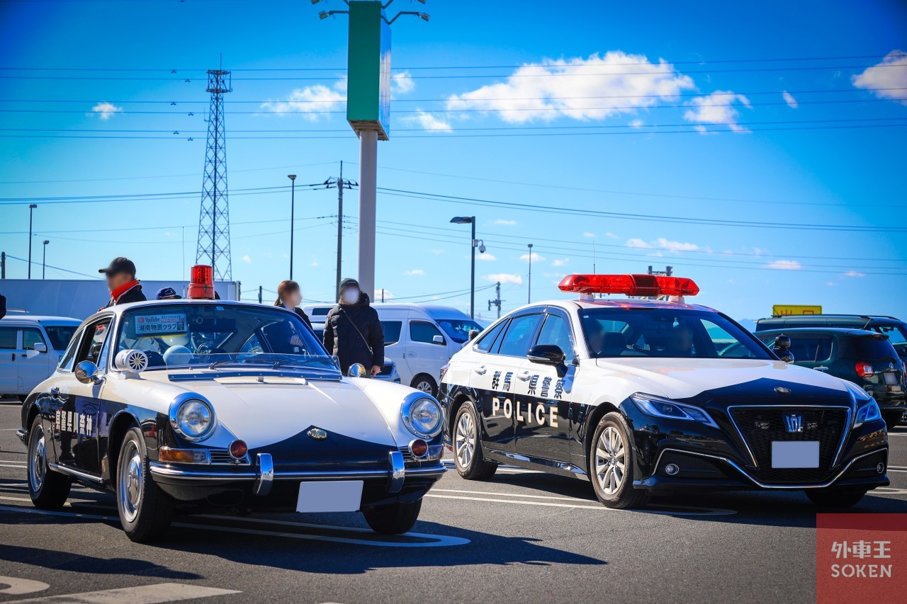 神奈川県警で使われていたポルシェ912パトカー。各地のイベントでもお馴染みの912パトカーが今年もエントリー。そして横には、912パトカーの所有者であるKさんも当日まで知らなかった(笑)という、主催者のサプライズで本物のクラウンのパトカーが登場。しかも現役のパトカーなのです!広報の婦警さんもノリが良くてこのショットが実現。2台の警察車輌はインパクトがあり、偶然居合わせたギャラリーもじっくりと新旧パトカーを眺めていました。こんな機会はめったにないですからね。