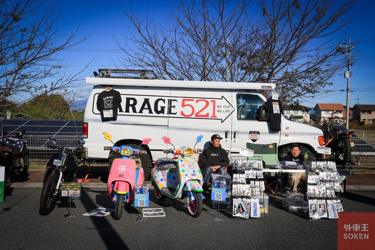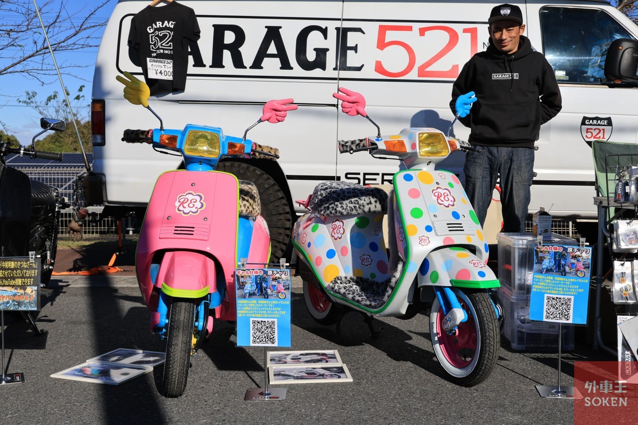 道の駅おおたの地元・群馬県太田市にショップを構えるスーパーカブカスタム専門店「GARAGE 521」。俳優の中尾明慶や山下健二郎の愛車であるカブのカスタマイズを手掛けているのもGARAGE 521なのです。展示されていたギャル仕様のスクーターも遊び心満載。この振れ幅の大きさにもGARAGE 521の底力を感じます。