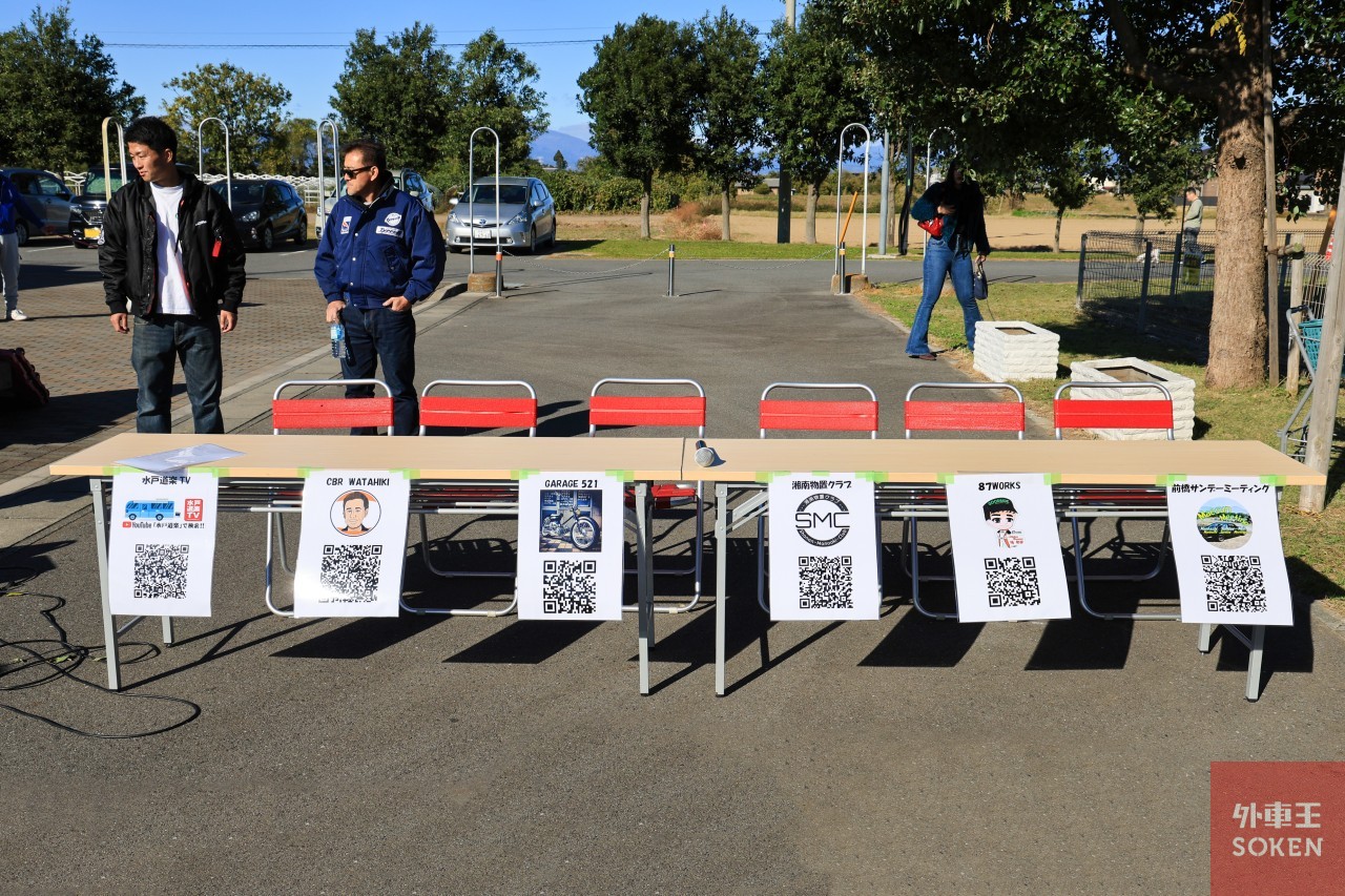 今回、計7組の乗り物系YouTuber/クリエイターが参加。また、道の駅おおたに偶然立ち寄った人たちも、珍しいクルマが敷地内の一角に並んでいることに気づき、興味深そうに展示車輌を眺めていました。